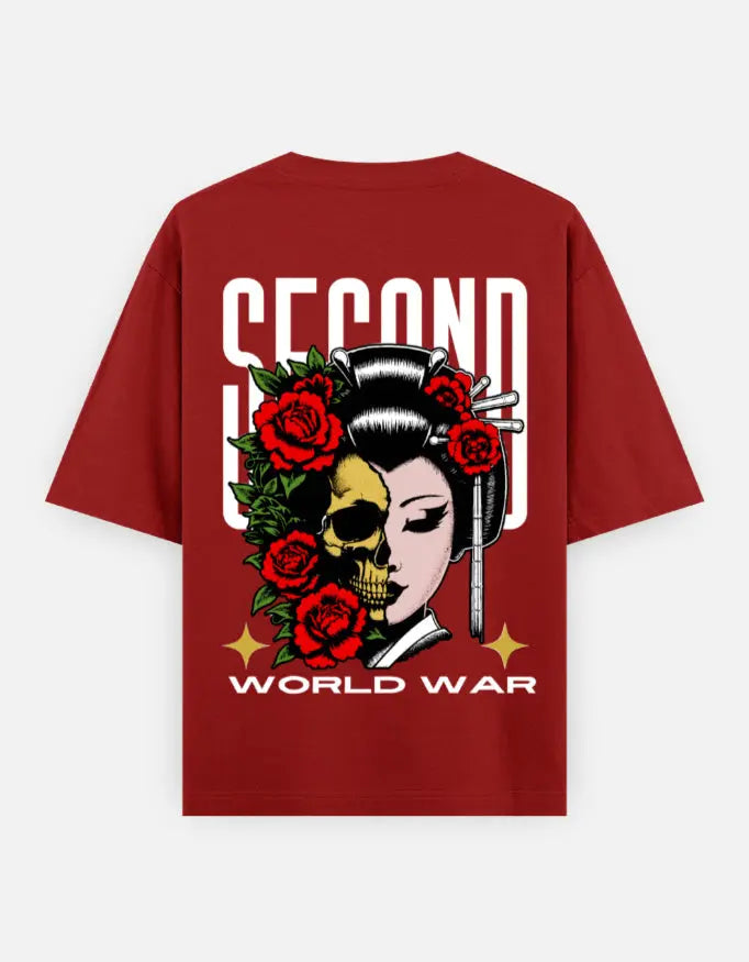 Unleash your bold side with the A War Within | Unisex Red Oversized T-Shirt. This soft cotton tee features a relaxed, drop-shoulder fit and a striking back print — a half-skull, half-Geisha framed by roses, symbolizing the clash of beauty and brutality. The red base and “SECOND WORLD WAR” typography make it a true statement piece. Durable, fade-resistant, and designed for those unafraid to stand out.