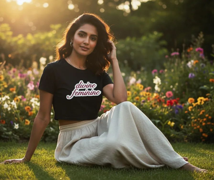 Channel your inner power and style with our Divine Feminine Graphic Crop Tee. Designed for the bold, confident, and unapologetically feminine, this cropped t-shirt is crafted from 100% premium cotton for a soft, breathable feel. The front showcases a sleek “Divine Feminine” script print in deep red and white, making it a perfect fusion of minimalism and statement energy.